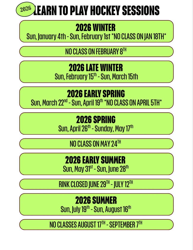 The Learn To Play Hockey program is designed for any individual looking to learn how to play the worlds fastest team sport. The program is $100 for 6 weeks of 60 minute lessons.